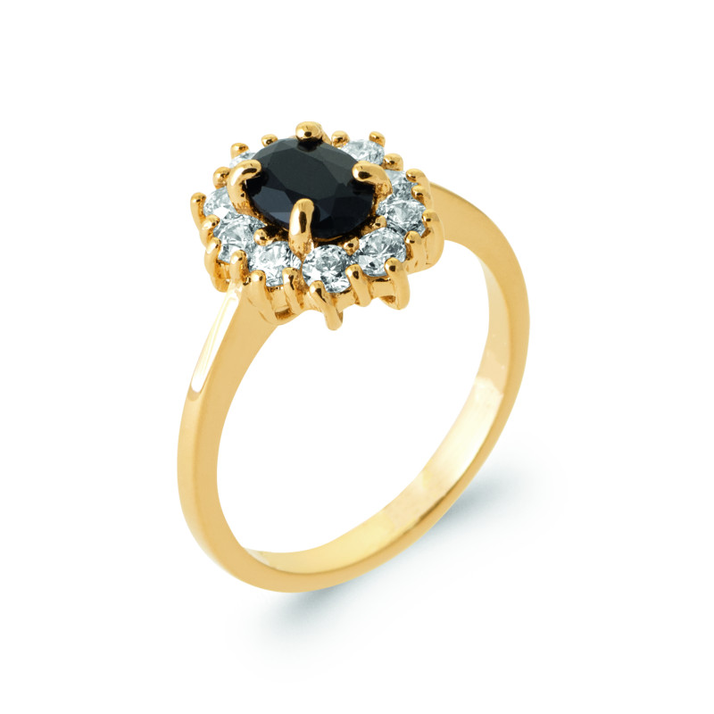 Succombez à la beauté de cette bague plaqué-Or et ornée de petites pierres en oxyde de zirconium blanc qui entoure la pierre en oxyde de zirconium bleu sertis griffes en son centre.
