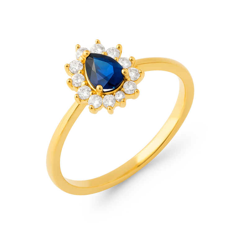 Bague 52d Femme Poire Entourage. Plaqué-Or Jaune. Oxyde de zirconium Sertis-Griffes Blanc Bleu saphir.