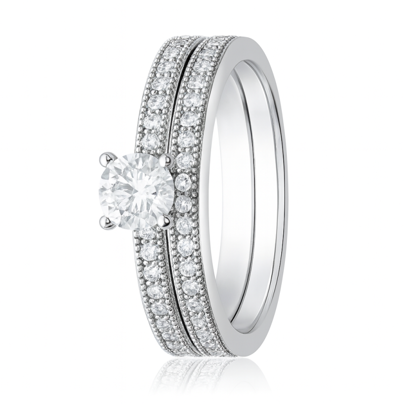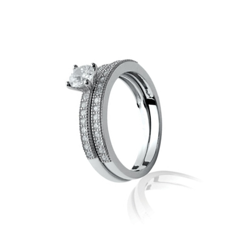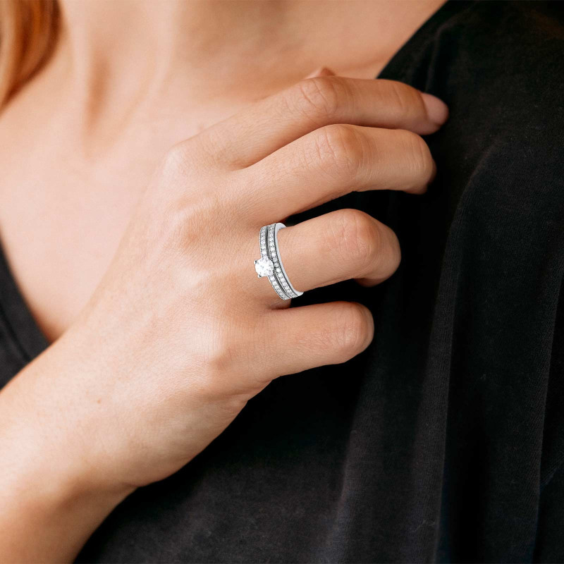 Cette bague solitaire en argent au design magnifique de 2 anneaux agrémentés d'oxydes de zirconium est la pièce unique qu'il vous faut. Fabriquée avec de l'argent,un métal précieux et de qualité supérieure, cette bague solitaire sera le porteur d'une signification émotionnelle profonde, et fera rêver votre moitié tout en laissant un souvenir inoubliable de votre demande en fiançailles.