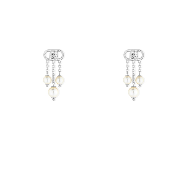 Boucles d'oreilles Femme Pendante Logo 3 Chaine Pampille poussette. Acier Blanc. Perle Blanche.