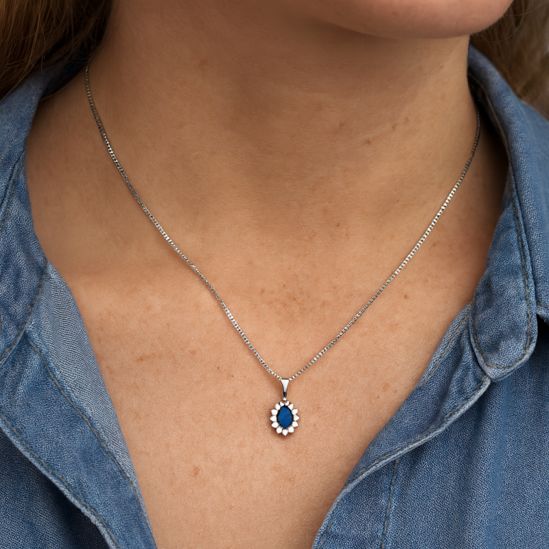 Collier 45cm Femme Solitaire Vénitienne Ovale 4 Griffes Agrémenté. Argent 3,56gr Blanc Rhodié. Oxyde de zirconium Blanc Bleu saphir Sertis-Griffes.