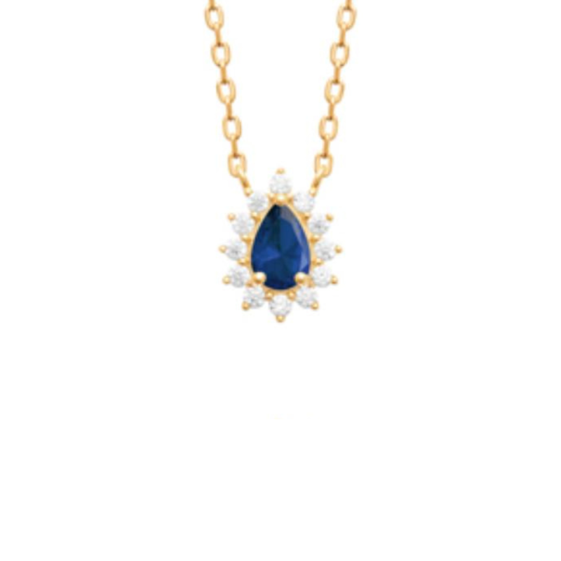 Collier 45cm Femme Poire Entourage Forçat Mousqueton. Plaqué-Or Jaune. Oxyde de zirconium Sertis-Griffes Blanc Bleu saphir.