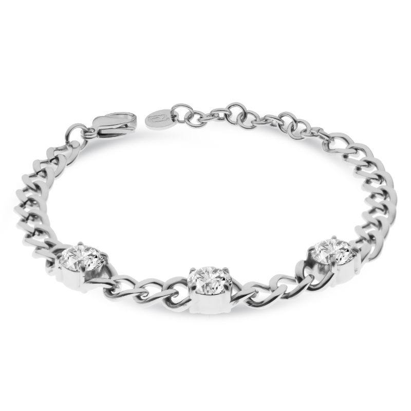 Bracelet 20cm Femme 17+3CM Gourmette Mousqueton. Acier Blanc. Oxyde de zirconium Sertis-Griffes Blanc.
