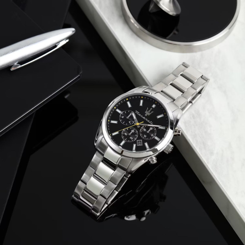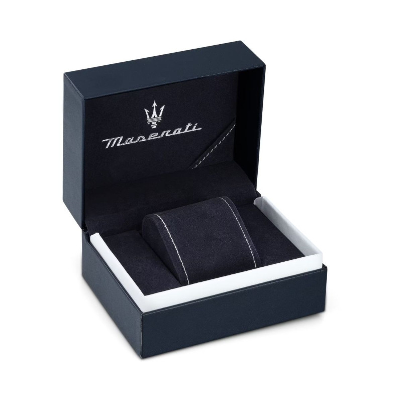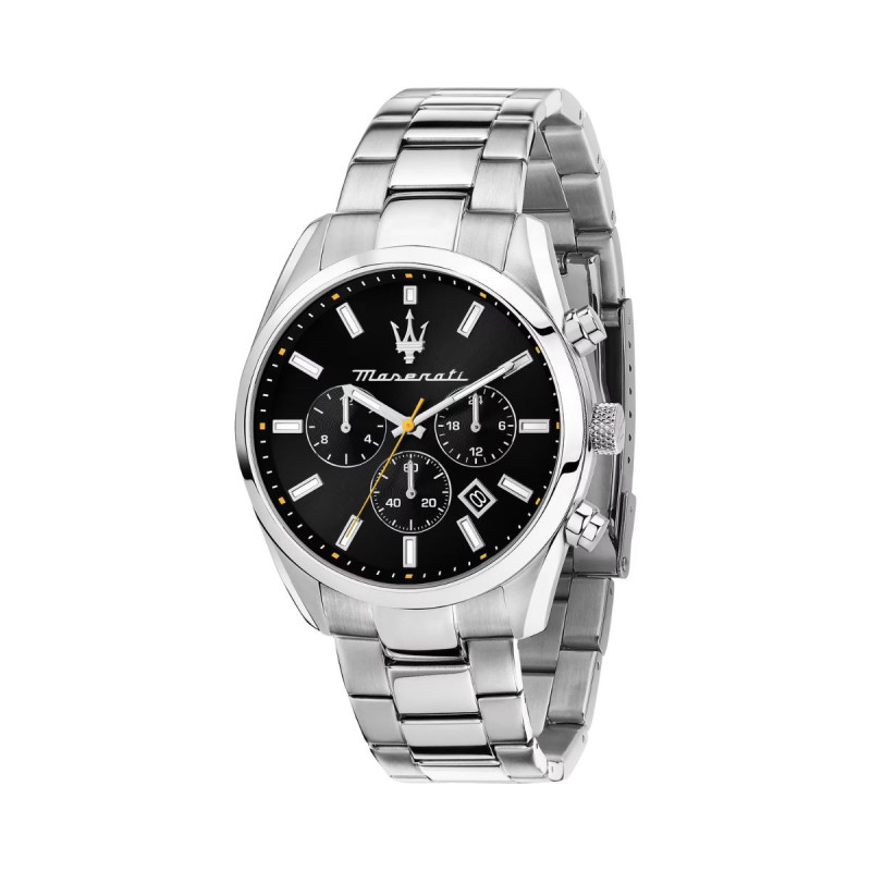 Montre pour homme Maserati, réf. R8853151010, collection ATTRAZIONE, en acier, mouvement quartz, multifonction. La montre est équipée d’un bracelet en acier avec boucle déployante de type plongeur avec poussoirs. Le boîtier rond de 43 mm est doté d’un cadran noir soleillé et d’un verre saphir résistant. Étanchéité jusqu’à 5 ATM. Les garde-temps Trident incarnent tout le savoir-faire technique et la maîtrise du design de Maserati.
