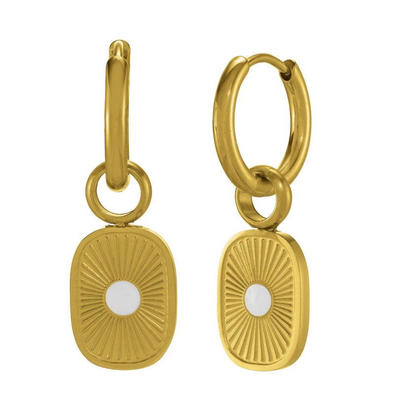 Créoles Femme Diamètre 10 Pampille Rectangle Perle Blanche Boule. Acier Jaune. Perle Blanche.