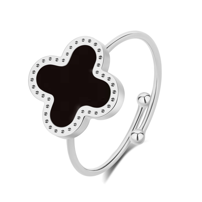 Bague 54d Femme Réglable Trèfle Noir. Acier Blanc. Pierre Noir.