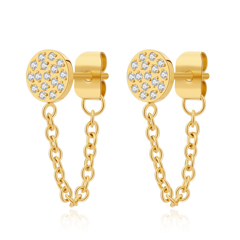 Boucles d'oreilles Femme Clou Rond Forçat poussette. Acier Jaune. Oxyde de zirconium Sertis-Grains Blanc.